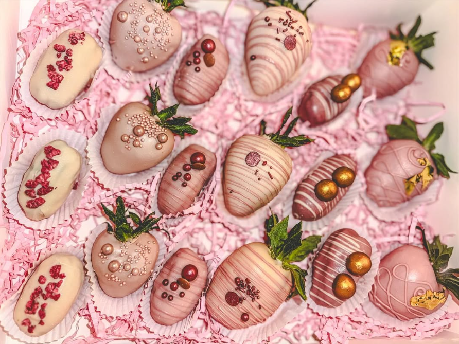Dubaicups en chocoladeomhulde aardbeien en ander fruit.